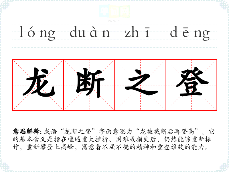 成语“龙断之登”字面意思为“龙被截断后再登高”。它的基本含义是指在遭遇重大挫折、困难或损失后,仍然能够重新振作,重新攀登上高峰,寓意着不屈不挠的精神和重整旗鼓的能力。