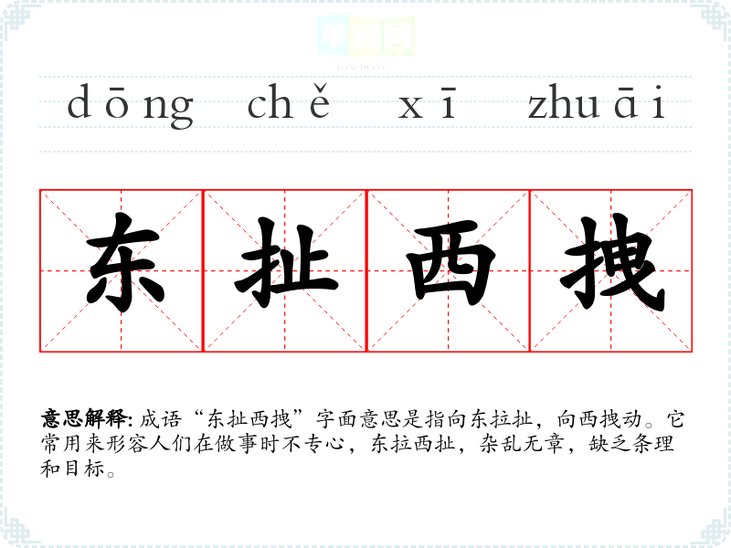 成语“东扯西拽”字面意思是指向东拉扯,向西拽动。它常用来形容人们在做事时不专心,东拉西扯,杂乱无章,缺乏条理和目标。