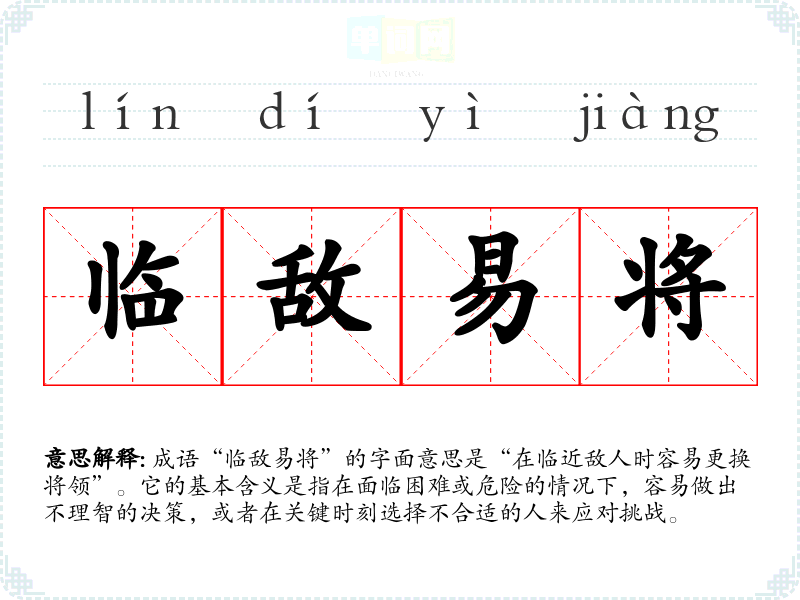 成语“临敌易将”的字面意思是“在临近敌人时容易更换将领”。它的基本含义是指在面临困难或危险的情况下,容易做出不理智的决策,或者在关键时刻选择不合适的人来应对挑战。