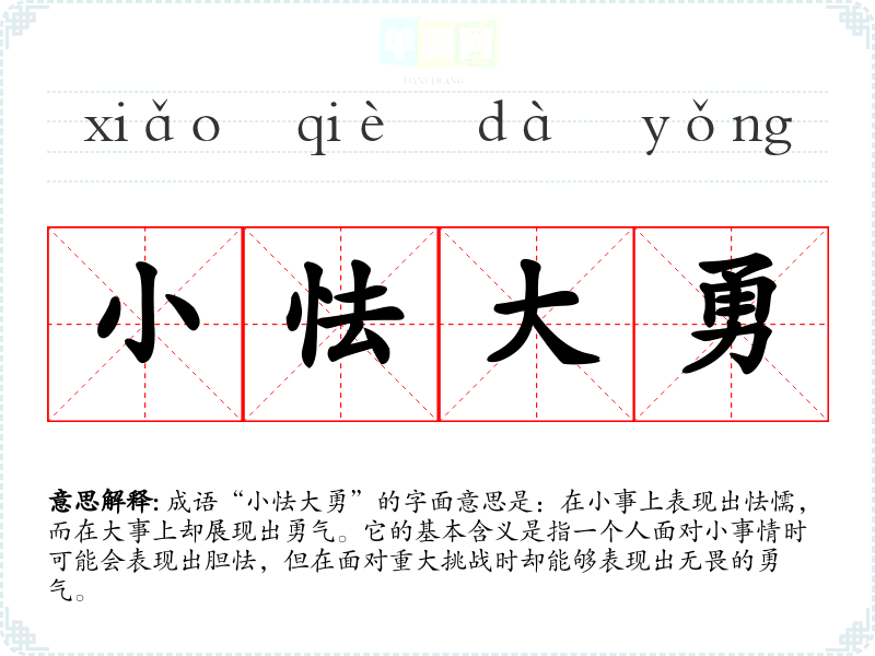 成语“小怯大勇”的字面意思是:在小事上表现出怯懦,而在大事上却展现出勇气。它的基本含义是指一个人面对小事情时可能会表现出胆怯,但在面对重大挑战时却能够表现出无畏的勇气。