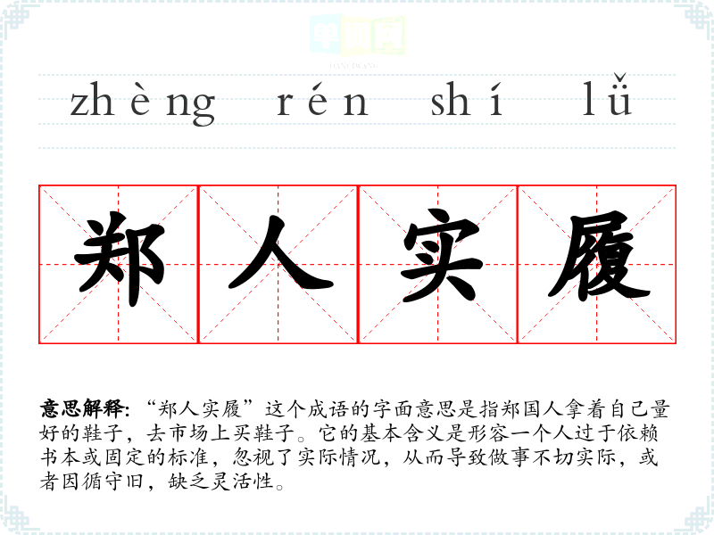 | 郑人实履 | 郑人:春秋时期郑国人。履:鞋。郑国人买鞋。比喻只相信书本,不相信客观实际。多用以讽刺教条主义者。 |