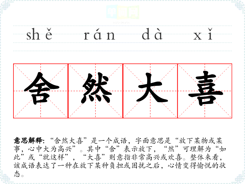 - 同义成语:如“心花怒放”、“喜出望外”等,这些成语都表达了高兴的状态,但“舍然大喜”强调的是在放下某种负担后的快乐。