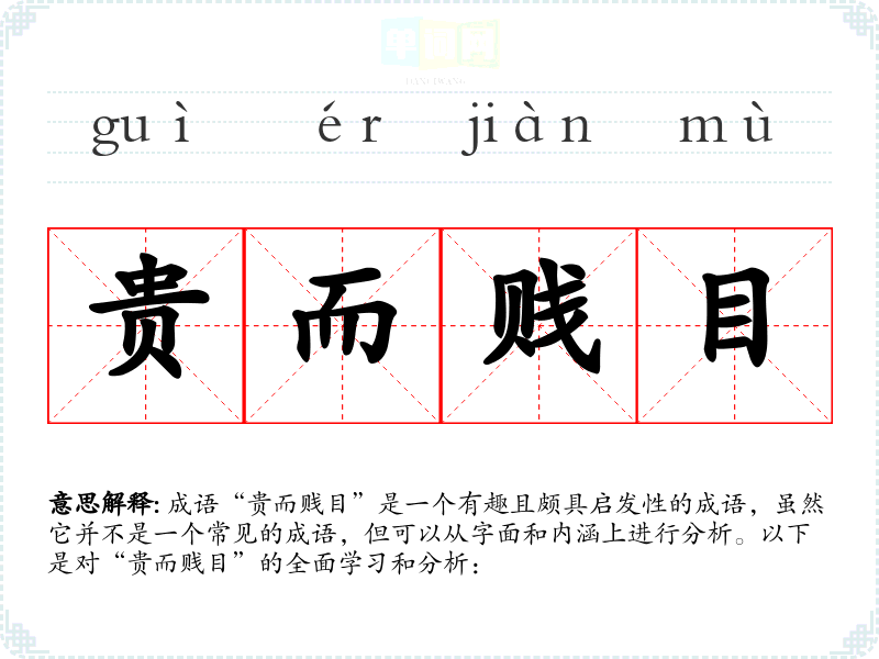 成语“贵而贱目”是一个有趣且颇具启发性的成语,虽然它并不是一个常见的成语,但可以从字面和内涵上进行分析。以下是对“贵而贱目”的全面学*和分析: