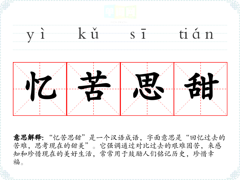 “忆苦思甜”是一个汉语成语,字面意思是“回忆过去的苦难,思考现在的甜美”。它强调通过对比过去的艰难困苦,来感知和珍惜现在的美好生活,常常用于鼓励人们铭记历史,珍惜幸福。
