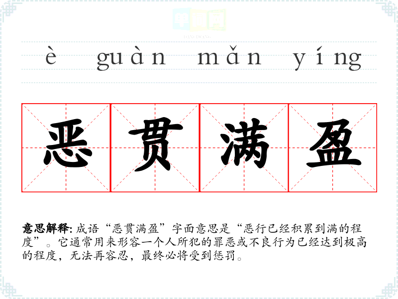 成语“恶贯满盈”字面意思是“恶行已经积累到满的程度”。它通常用来形容一个人所犯的罪恶或不良行为已经达到极高的程度,无法再容忍,最终必将受到惩罚。