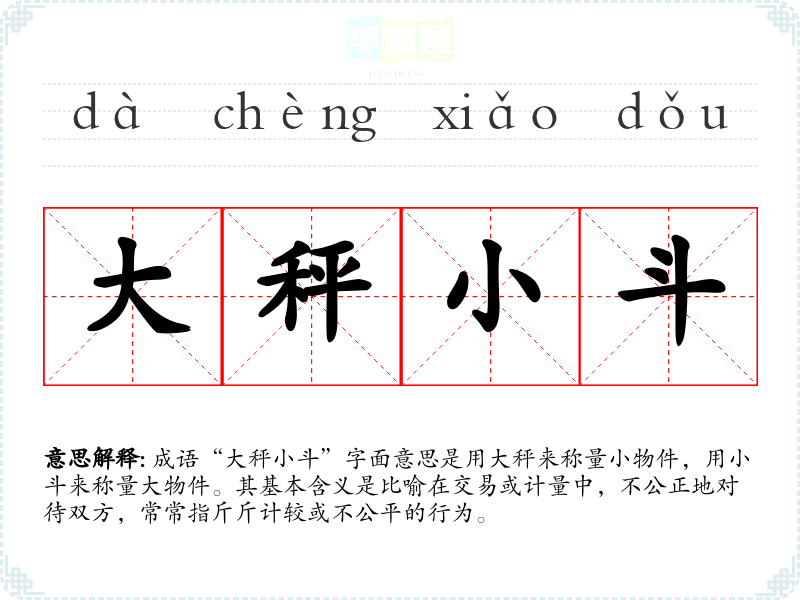 成语“大秤小斗”字面意思是用大秤来称量小物件,用小斗来称量大物件。其基本含义是比喻在交易或计量中,不公正地对待双方,常常指斤斤计较或不公平的行为。