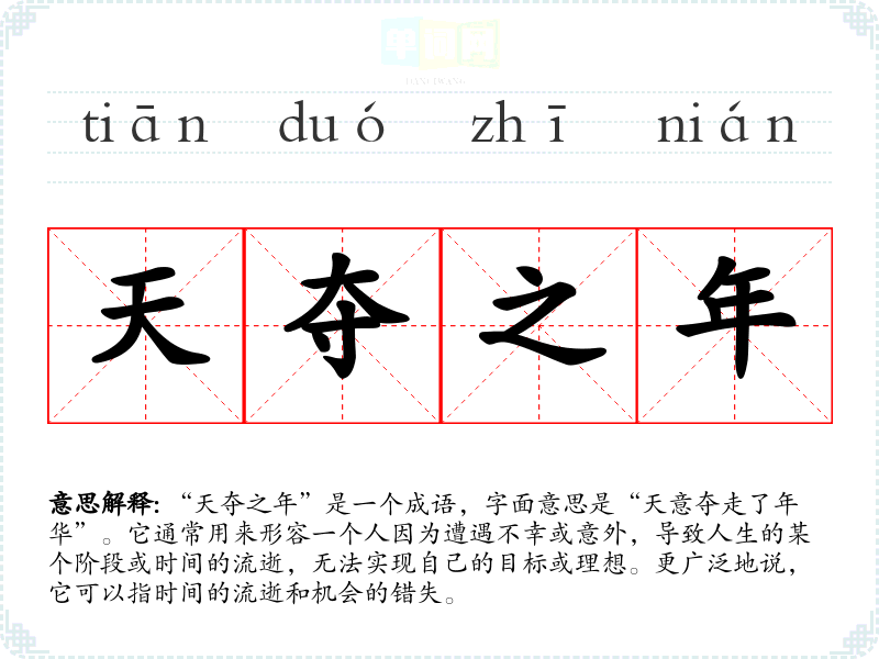 “天夺之年”是一个成语,字面意思是“天意夺走了年华”。它通常用来形容一个人因为遭遇不幸或意外,导致人生的某个阶段或时间的流逝,无法实现自己的目标或理想。更广泛地说,它可以指时间的流逝和机会的错失。
