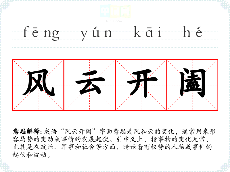 成语“风云开阖”字面意思是风和云的变化,通常用来形容局势的变动或事情的发展起伏。引申义上,指事物的变化无常,尤其是在政治、军事和社会等方面,暗示着有权势的人物或**的起伏和波动。