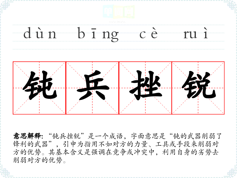 “钝兵挫锐”是一个成语,字面意思是“钝的武器削弱了锋利的武器”,引申为指用不如对方的力量、工具或手段来削弱对方的优势。其基本含义是强调在竞争或冲突中,利用自身的劣势去削弱对方的优势。