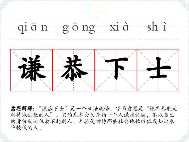 “谦恭下士”是一个汉语成语,字面意思是“谦卑恭敬地对待地位低的人”。它的基本含义是指一个人谦虚礼貌,不以自己的身份或地位看不起别人,尤其是对待那些社会地位较低或知识水平较低的人。