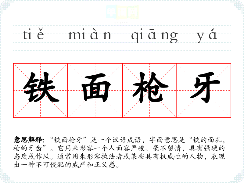“铁面枪牙”是一个汉语成语,字面意思是“铁的面孔,枪的牙齿”。它用来形容一个人面容严峻、毫不留情,具有强硬的态度或作风。通常用来形容执法者或某些具有权威性的人物,表现出一种不可侵犯的威严和正义感。
