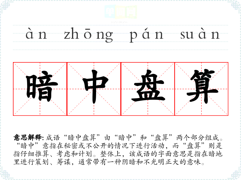 成语“暗中盘算”由“暗中”和“盘算”两个部分组成。“暗中”意指在秘密或不公开的情况下进行活动,而“盘算”则是指仔细推算、考虑和计划。整体上,该成语的字面意思是指在暗地里进行策划、筹谋,通常带有一种阴暗和不光明正大的意味。