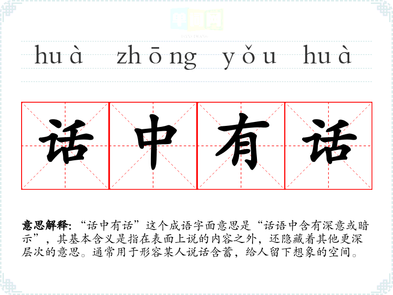 “话中有话”这个成语字面意思是“话语中含有深意或暗示”,其基本含义是指在表面上说的内容之外,还隐藏着其他更深层次的意思。通常用于形容某人说话含蓄,给人留下想象的空间。