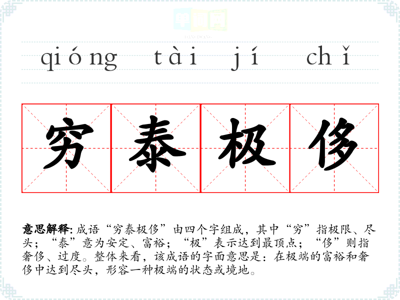 成语“穷泰极侈”由四个字组成,其中“穷”指极限、尽头;“泰”意为安定、富裕;“极”表示达到最顶点;“侈”则指奢侈、过度。整体来看,该成语的字面意思是:在极端的富裕和奢侈中达到尽头,形容一种极端的状态或境地。