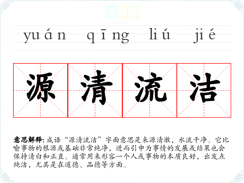 “源清流洁”源自于古代对水的比喻,水的清澈与洁净被认为是一个自然界的理想状态,反映了人们对纯净事物的向往。具体的历史背景并不明确,但可以理解为与古代文人对于清流、洁净的追求有直接关系。在古代诗词中,常常会提到清流的意象,以表达对品德高尚、清白无私的人的赞美。