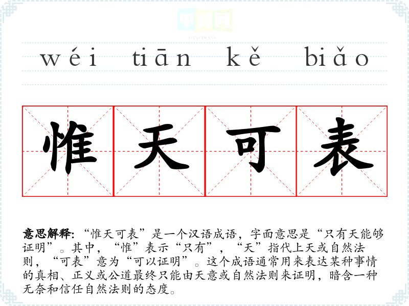 “惟天可表”是一个汉语成语,字面意思是“只有天能够证明”。其中,“惟”表示“只有”,“天”指代上天或自然法则,“可表”意为“可以证明”。这个成语通常用来表达某种事情的真相、正义或公道最终只能由天意或自然法则来证明,暗含一种无奈和信任自然法则的态度。