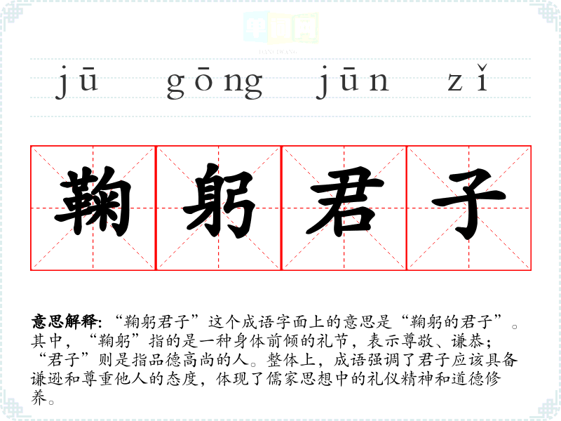 “鞠躬君子”这个成语字面上的意思是“鞠躬的君子”。其中,“鞠躬”指的是一种身体前倾的礼节,表示尊敬、谦恭;“君子”则是指品德高尚的人。整体上,成语强调了君子应该具备谦逊和尊重他人的态度,体现了儒家思想中的礼仪精神和道德修养。