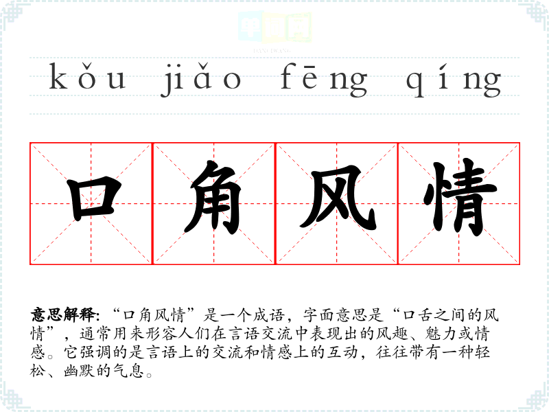 “口角风情”是一个成语,字面意思是“口舌之间的风情”,通常用来形容人们在言语交流中表现出的风趣、魅力或情感。它强调的是言语上的交流和情感上的互动,往往带有一种轻松、幽默的气息。