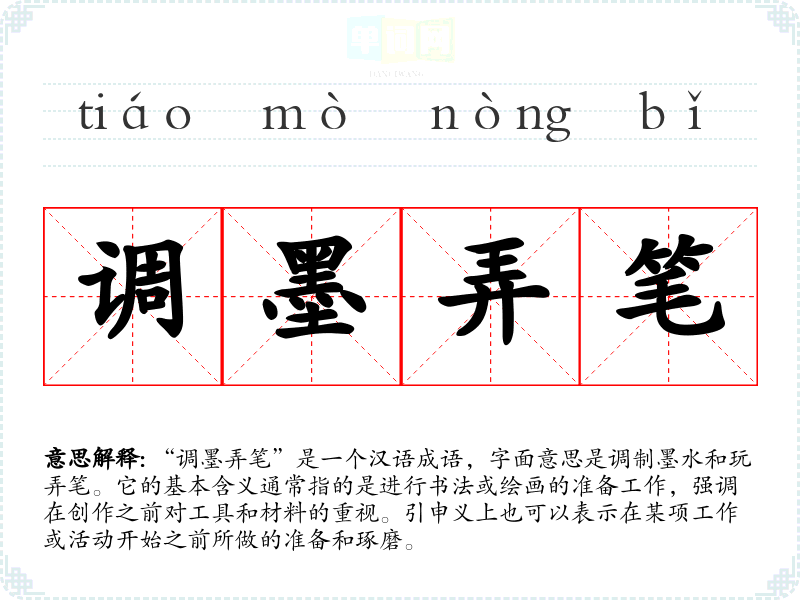 “调墨弄笔”是一个汉语成语,字面意思是调制墨水和玩弄笔。它的基本含义通常指的是进行书法或绘画的准备工作,强调在创作之前对工具和材料的重视。引申义上也可以表示在某项工作或活动开始之前所做的准备和琢磨。