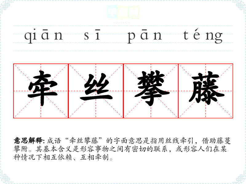 成语“牵丝攀藤”的字面意思是指用丝线牵引,借助藤蔓攀附。其基本含义是形容事物之间有密切的联系,或形容人们在某种情况下相互依赖、互相牵制。