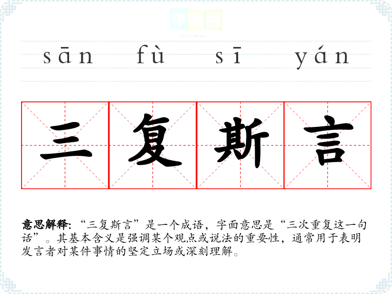 “三复斯言”是一个成语,字面意思是“三次重复这一句话”。其基本含义是强调某个观点或说法的重要性,通常用于表明发言者对某件事情的坚定立场或深刻理解。