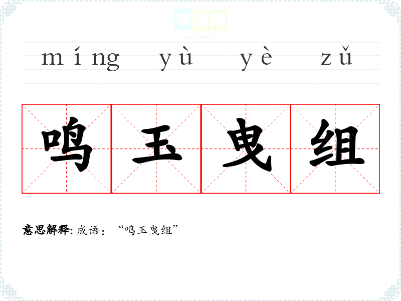 “鸣玉曳组”字面意思是“玉器发出声响,带着装饰品拖曳”。这里的“鸣玉”指的是玉器的声音,象征着美好、高贵的事物;“曳组”则指拖曳的装饰物,传达出一种华丽的景象。整体来看,该成语主要用以形容一种华丽、高贵的状态或情景,暗示着一种美好的氛围。