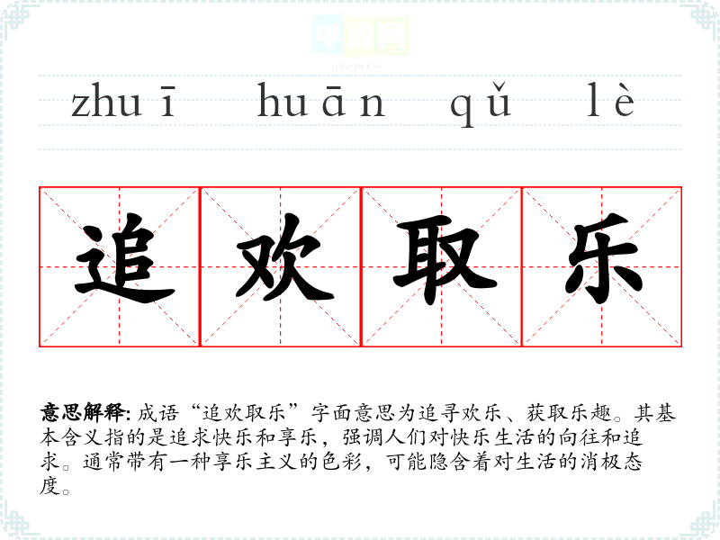 - 日常对话:在闲聊中,朋友之间可能会用“追欢取乐”来调侃某人过于注重享乐而忽视工作的态度。
