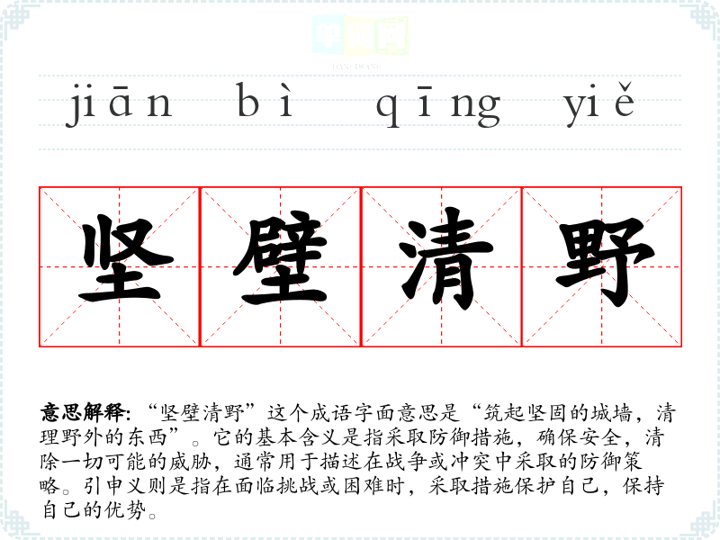“坚壁清野”这个成语字面意思是“筑起坚固的城墙,清理野外的东西”。它的基本含义是指采取防御措施,确保安全,清除一切可能的威胁,通常用于描述在战争或冲突中采取的防御策略。引申义则是指在面临挑战或困难时,采取措施保护自己,保持自己的优势。