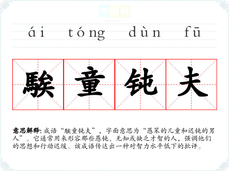 成语“騃童钝夫”,字面意思为“愚笨的儿童和迟钝的男人”。它通常用来形容那些愚钝、无知或缺乏才智的人,强调他们的思想和行动迟缓。该成语传达出一种对智力水平低下的批评。