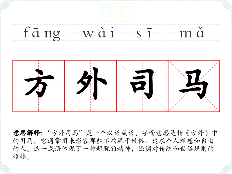 “方外司马”是一个汉语成语,字面意思是指《方外》中的司马。它通常用来形容那些不拘泥于世俗、追求个人理想和自由的人。这一成语体现了一种超脱的精神,强调对传统和世俗规则的超越。
