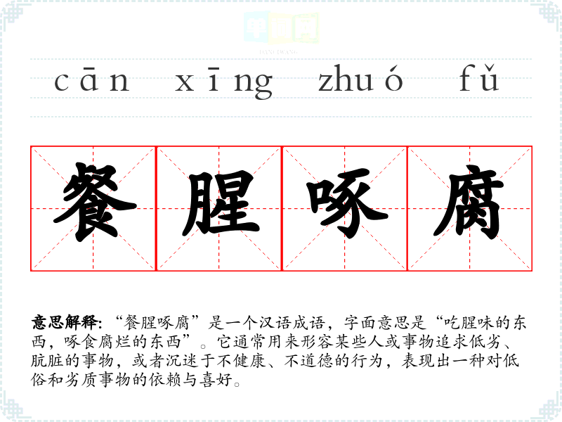 “餐腥啄腐”是一个汉语成语,字面意思是“吃腥味的东西,啄食腐烂的东西”。它通常用来形容某些人或事物追求低劣、肮脏的事物,或者沉迷于不健康、不道德的行为,表现出一种对低俗和劣质事物的依赖与喜好。