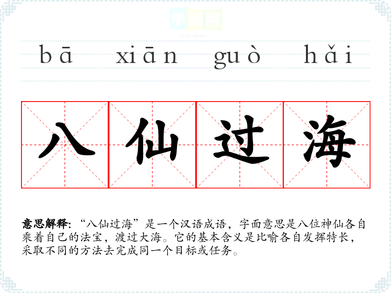 “八仙过海”是一个汉语成语,字面意思是八位神仙各自乘着自己的法宝,渡过大海。它的基本含义是比喻各自发挥特长,采取不同的方法去完成同一个目标或任务。