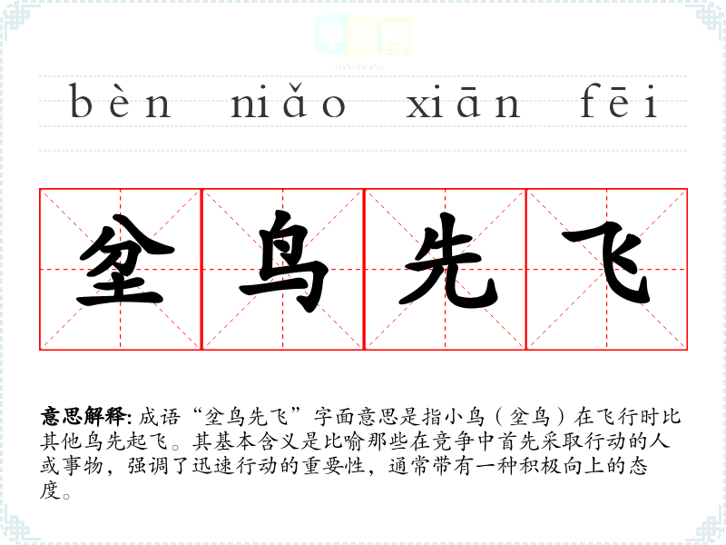 成语“坌鸟先飞”字面意思是指**(坌鸟)在飞行时比其他鸟先起飞。其基本含义是比喻那些在竞争中首先采取行动的人或事物,强调了迅速行动的重要性,通常带有一种积极向上的态度。