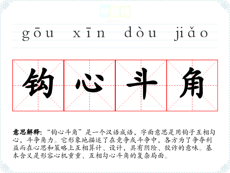 “钩心斗角”是一个汉语成语,字面意思是用钩子互相勾心,斗争角力。它形象地描述了在竞争或斗争中,各方为了争夺利益而在心思和策略上互相算计、设计,具有阴险、狡诈的意味。基本含义是形容心机重重、互相勾心斗角的复杂局面。