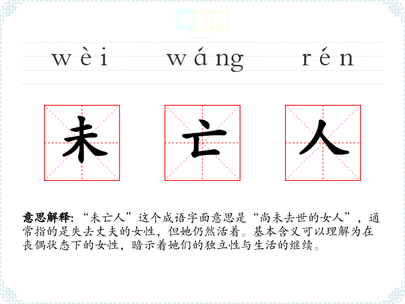 “未亡人”这个成语字面意思是“尚未去世的女人”,通常指的是失去丈夫的女性,但她仍然活着。基本含义可以理解为在丧偶状态下的女性,暗示着她们的独立性与生活的继续。