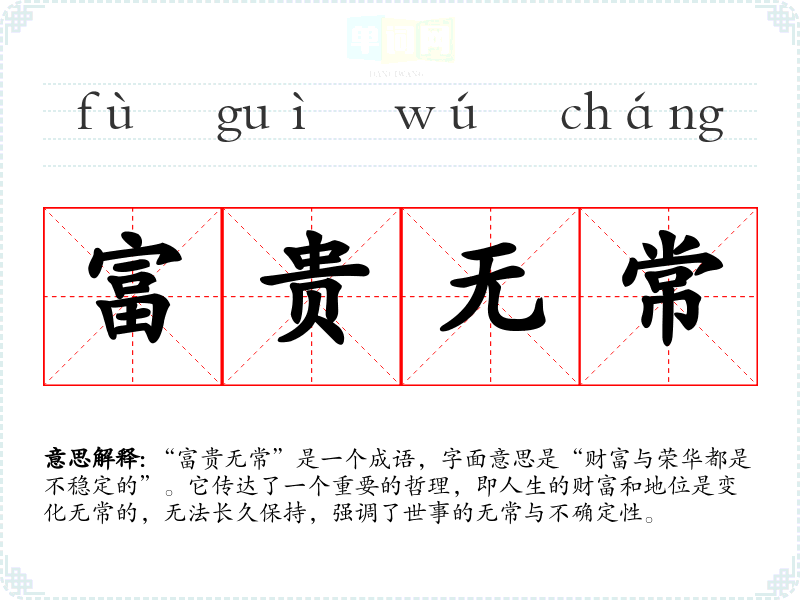 “富贵无常”是一个成语,字面意思是“财富与荣华都是不稳定的”。它传达了一个重要的哲理,即人生的财富和地位是变化无常的,无法长久保持,强调了世事的无常与不确定性。