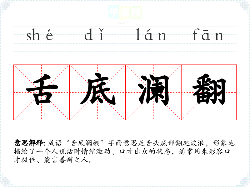 成语“舌底澜翻”字面意思是舌头底部翻起波浪,形象地描绘了一个人说话时情绪激动、口才出众的状态,通常用来形容口才极佳、能言善辩之人。
