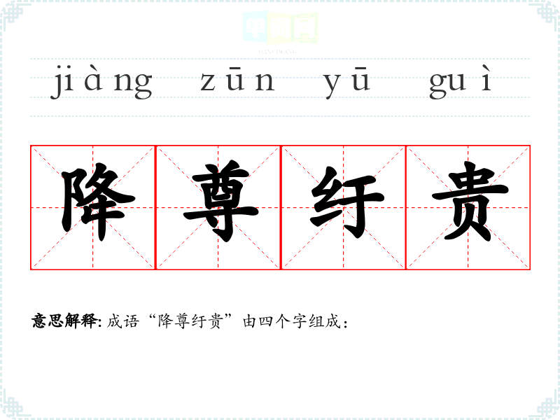 | 降尊纡贵 | 纡:弯曲,屈抑。降抑尊贵的地位,谦以自处。 |