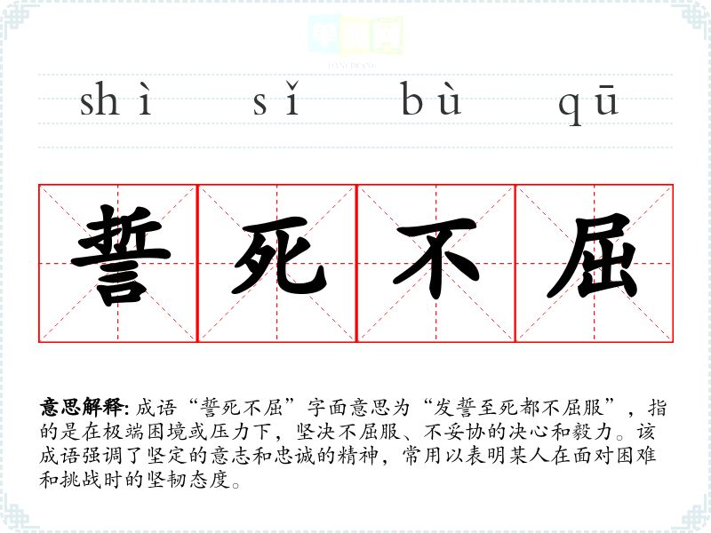 成语“誓死不屈”字面意思为“发誓至死都不屈服”,指的是在极端困境或压力下,坚决不屈服、不妥协的决心和毅力。该成语强调了坚定的意志和忠诚的精神,常用以表明某人在面对困难和挑战时的坚韧态度。