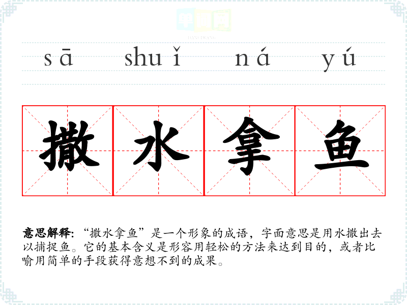 “撒水拿鱼”是一个形象的成语,字面意思是用水撒出去以捕捉鱼。它的基本含义是形容用轻松的方法来达到目的,或者比喻用简单的手段获得意想不到的成果。