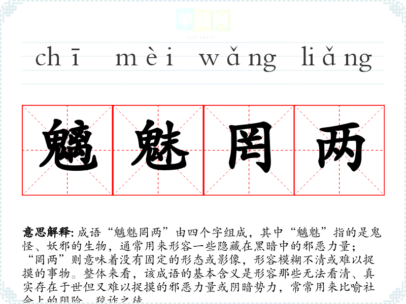 成语“魑魅罔两”由四个字组成,其中“魑魅”指的是鬼怪、妖邪的生物,通常用来形容一些隐藏在黑暗中的邪恶力量;“罔两”则意味着没有固定的形态或影像,形容模糊不清或难以捉摸的事物。整体来看,该成语的基本含义是形容那些无法看清、真实存在于世但又难以捉摸的邪恶力量或阴暗势力,常常用来比喻社会上的阴险、狡诈之徒。