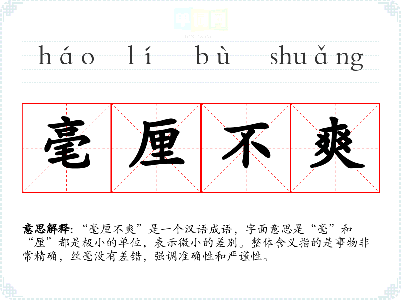 “毫厘不爽”是一个汉语成语,字面意思是“毫”和“厘”都是极小的单位,表示微小的差别。整体含义指的是事物非常精确,丝毫没有差错,强调准确性和严谨性。