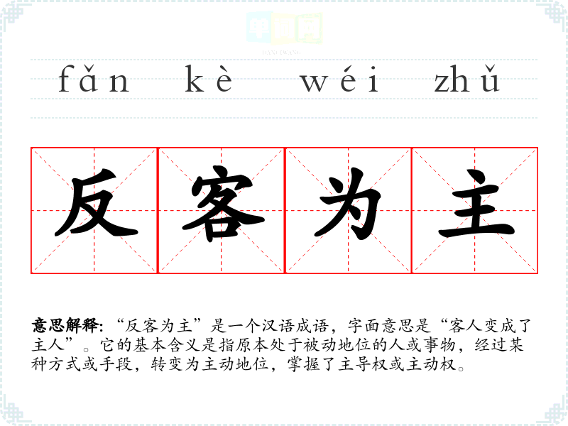 “反客为主”是一个汉语成语,字面意思是“客人变成了主人”。它的基本含义是指原本处于被动地位的人或事物,经过某种方式或手段,转变为主动地位,掌握了主导权或主动权。