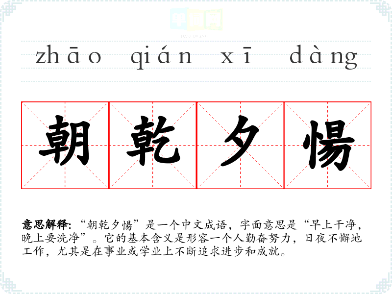 “朝乾夕愓”是一个中文成语,字面意思是“早上干净,晚上要洗净”。它的基本含义是形容一个人勤奋努力,日夜不懈地工作,尤其是在事业或学业上不断追求进步和成就。