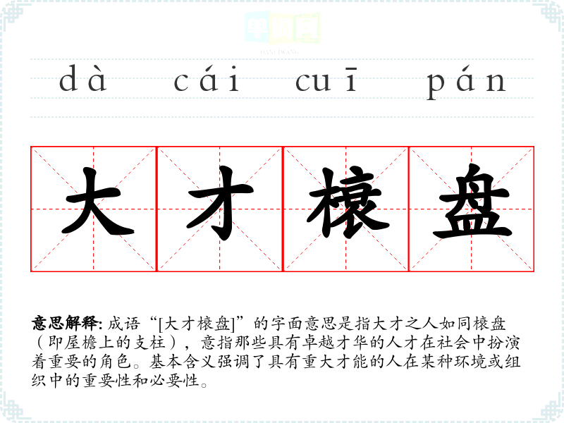 在中国传统文化中,人才被视为国家和社会发展的基石。成语“[大才榱盘]”体现了对人才的崇尚和重视,尤其是在现代社会,随着竞争的加剧,企业和组织对核心人才的需求愈发明显。