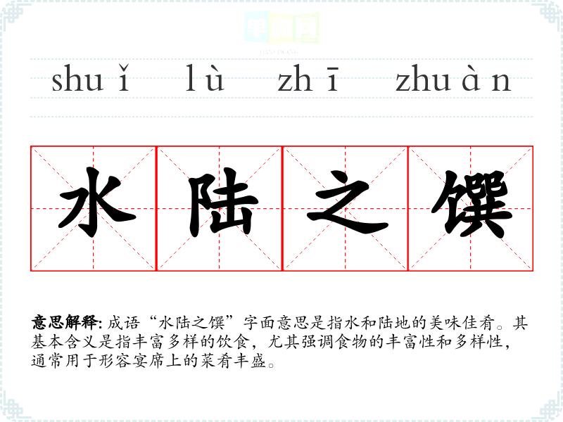 成语“水陆之馔”字面意思是指水和陆地的美味佳肴。其基本含义是指丰富多样的饮食,尤其强调食物的丰富性和多样性,通常用于形容宴席上的菜肴丰盛。