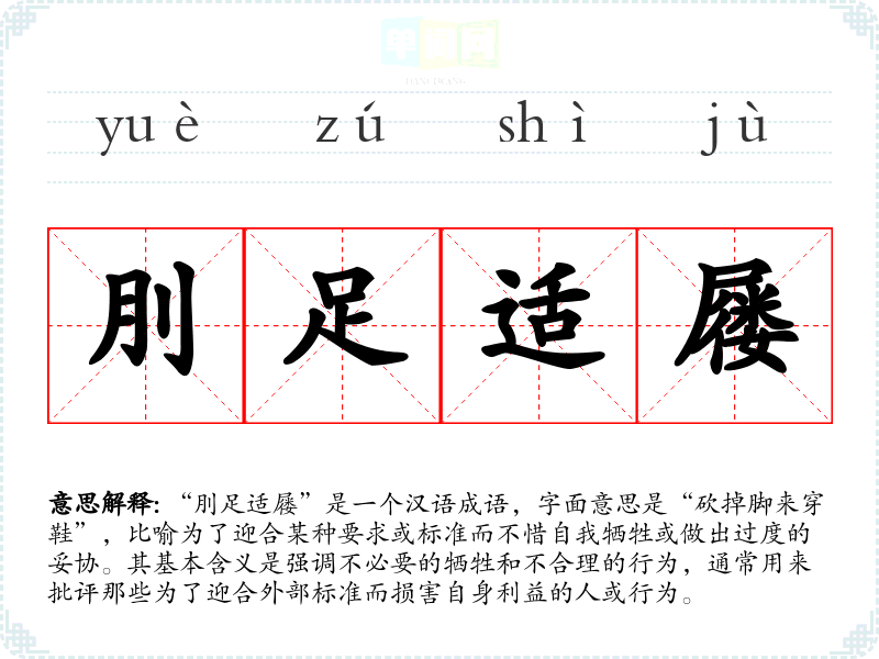 | 刖足适屦 | 刖:截断;屦:鞋。鞋小脚大,就把脚削去一块来凑和鞋的大小。比喻不合理的牵就凑合或不顾具体条件,生搬硬套 |