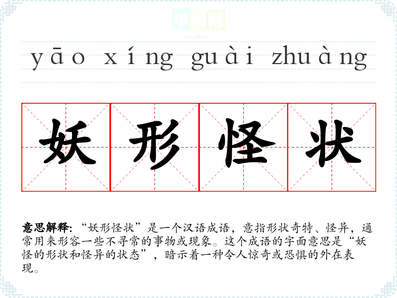 “妖形怪状”并没有明确的历史典故来源,但可以推测它与**古代文学中常见的妖怪、鬼神等形象有关。在许多古代文献中,妖怪是常被描述为外形奇异、令人不安的存在,因此这一成语也反映了这种文化背景。