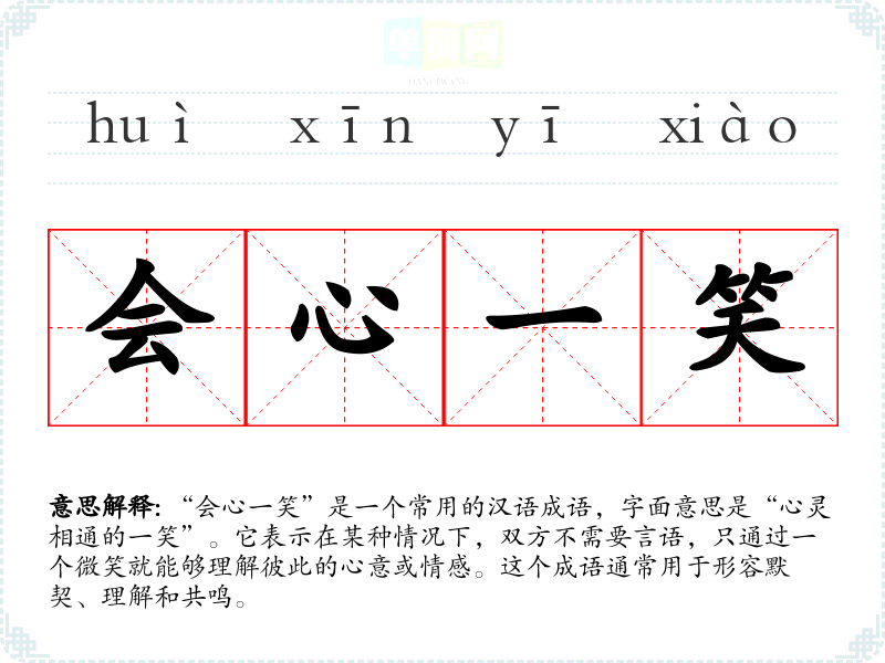 “会心一笑”是一个常用的汉语成语,字面意思是“心灵相通的一笑”。它表示在某种情况下,双方不需要言语,只通过一个微笑就能够理解彼此的心意或情感。这个成语通常用于形容默契、理解和共鸣。