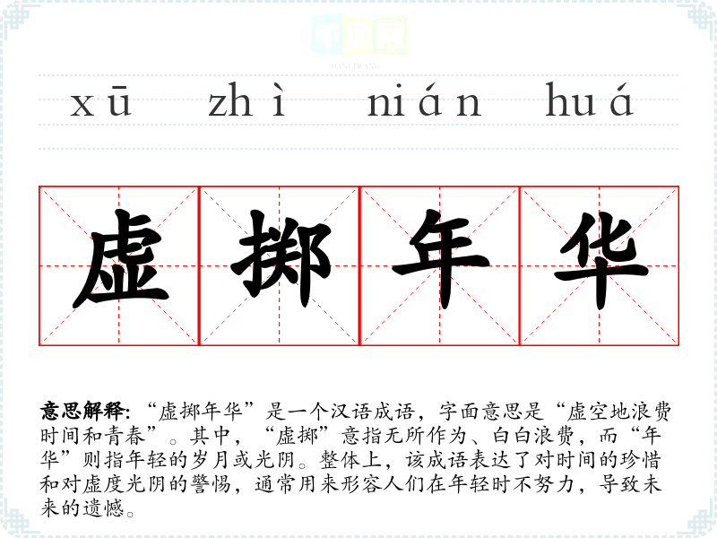 “虚掷年华”是一个汉语成语,字面意思是“虚空地浪费时间和青春”。其中,“虚掷”意指无所作为、白白浪费,而“年华”则指年轻的岁月或光阴。整体上,该成语表达了对时间的珍惜和对虚度光阴的警惕,通常用来形容人们在年轻时不努力,导致未来的遗憾。